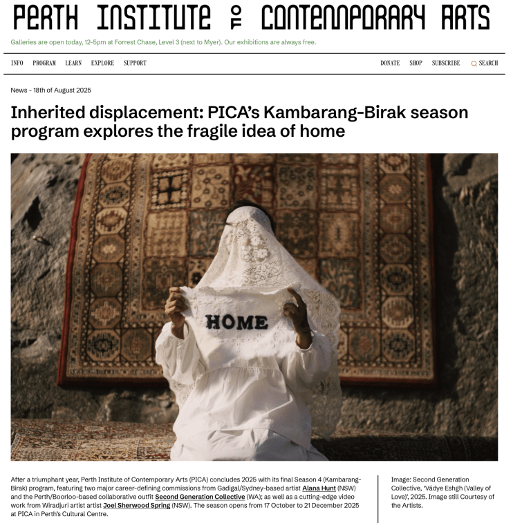 WHAT'S ON PERTH INSTITUTE OF CONTEMPORARY ART | 17 October - 21 December 2025Second Generation Collective CINEMA CINE-THEATRE IMMERSIVE ART VIDEO ART WHAT'S ON 2025 | Inherited Displacement 2025 | 17 October, Visual Arts & Craft Strategy, Perth Institute of Contemporary Arts x Second Generation Collective, The Valley of Love 2025 | 11 July, National Art School, Neighbours at the Gate, Curated by Clothilde Bullen, Zali Morgan & Michael Do [Nieghbours at the Gate]